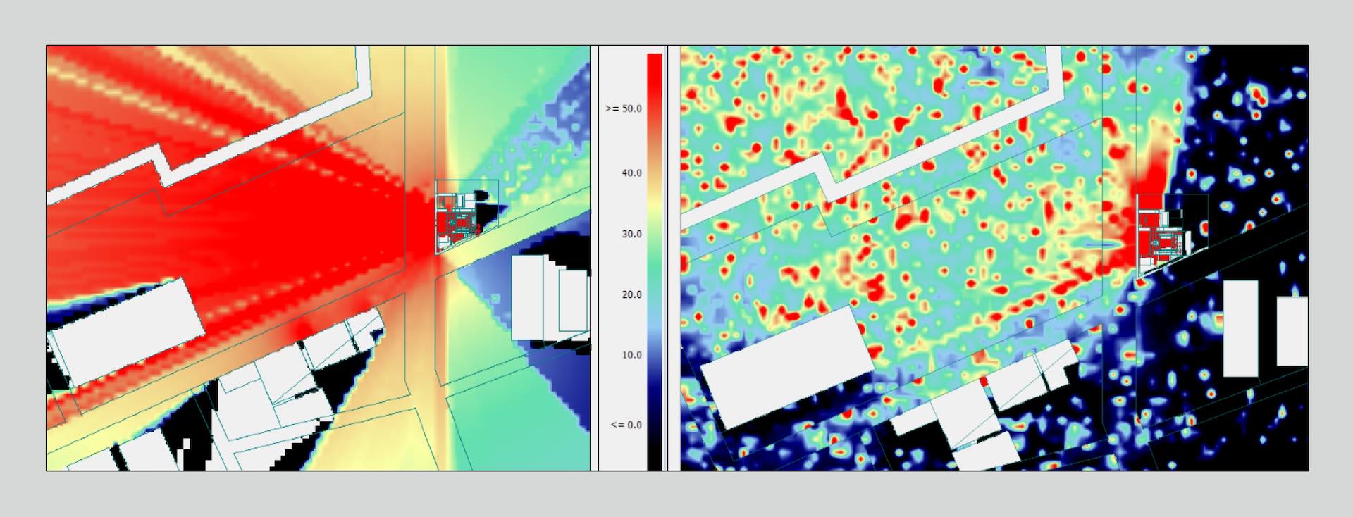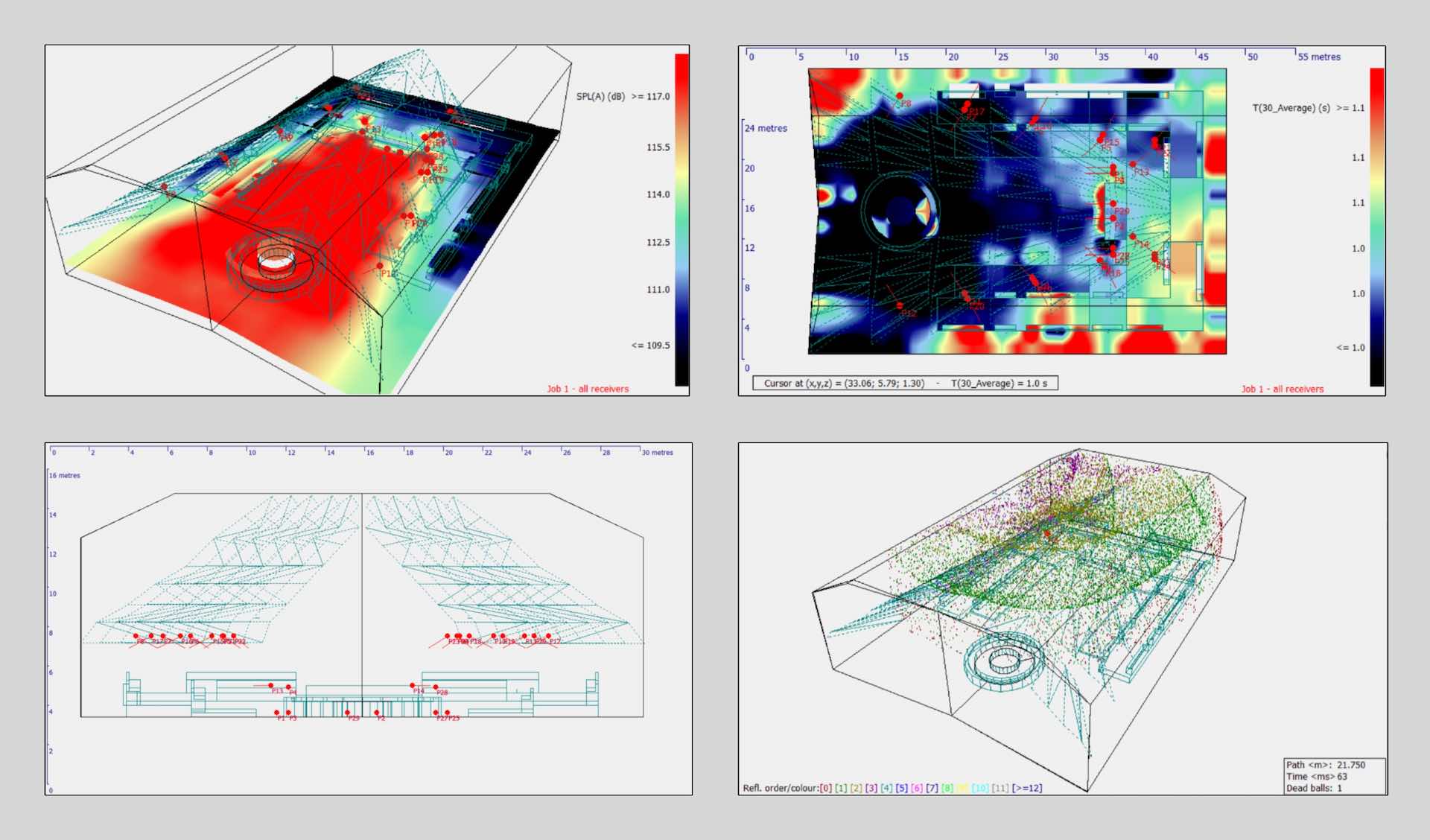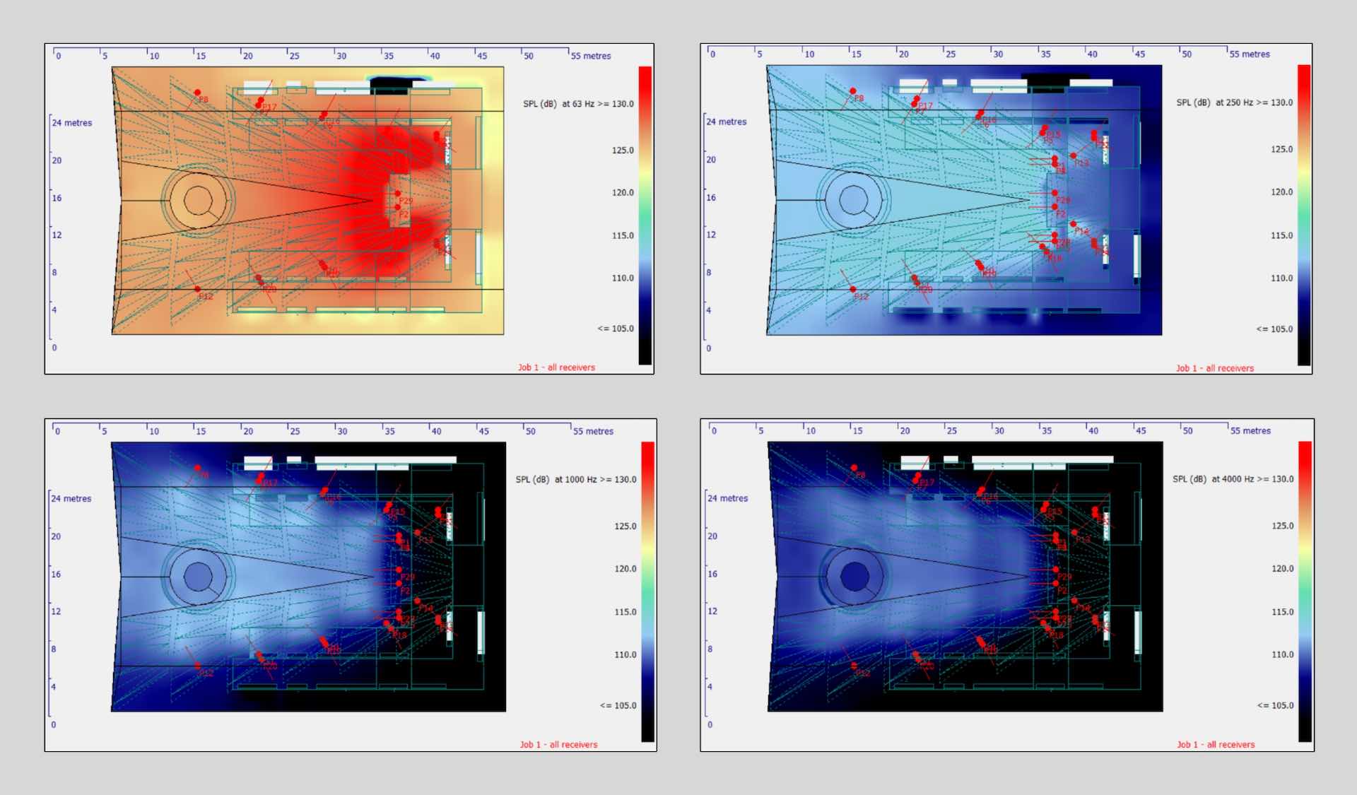 Outdoor acoustic and sound propagation simulations were carried out to predict sound levels, coverage, and dispersion across the venue and its surroundings. Using a detailed 3D model, we analyzed sound propagation, reflections, frequency-dependent behavior, and off-site impact to control energy within the audience area while limiting spill beyond the venue boundaries. This data-driven approach informed system layout, aiming, and level management to support high-impact performances while respecting the urban and environmental context.