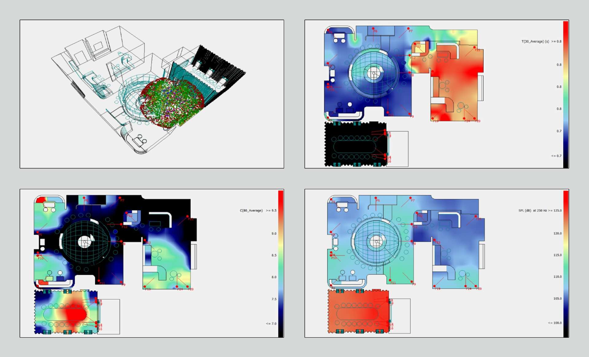 Acoustic and electro-acoustic simulations were used to predict how sound would behave throughout the venue before construction and system tuning. Using a detailed 3D model, we evaluated sound propagation, reverberation time, clarity, and sound pressure levels to ensure balanced energy, intelligibility, and even coverage across all areas. This simulation-driven approach allowed the acoustic environment to be optimized for atmosphere and comfort while avoiding excessive volume, echo, and listener fatigue.